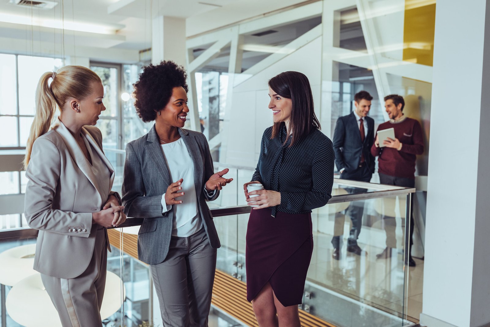 Diverse group of professional women smiling and collaborating around a laptop in a bright modern office, symbolizing teamwork and employee engagement.